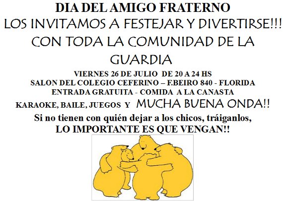 El viernes 26 de julio estamos invitados a festejar juntos el Día del amigo fraterno. Nos encontraremos en el patio cubierto del Colegio, a las 20hs.